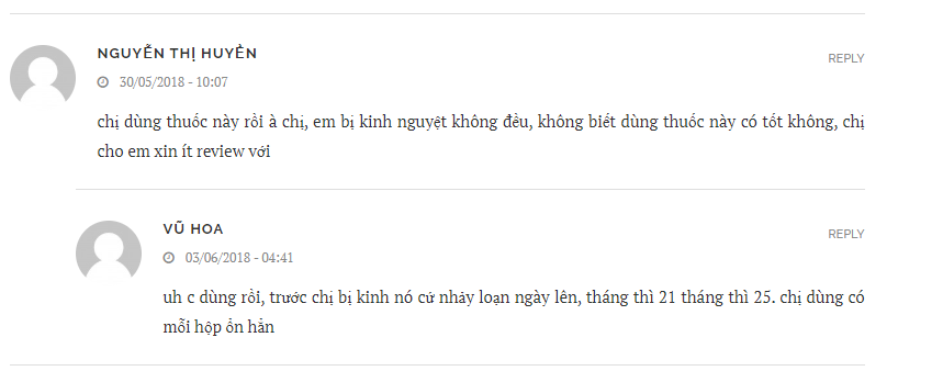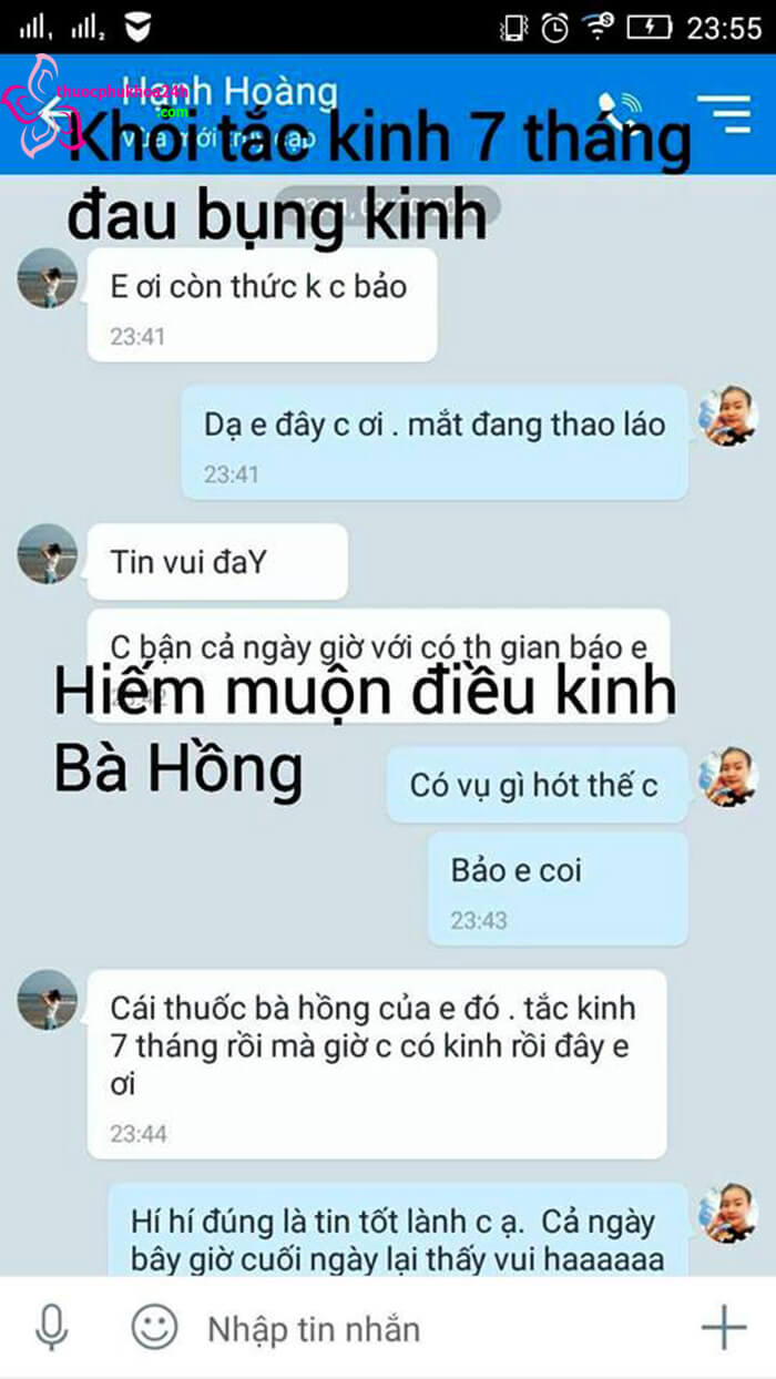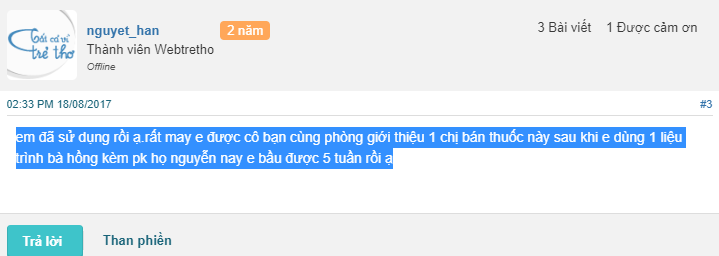Tài khoản nguyet_han chia sẻ: “em đã sử dụng rồi ạ.rất may e được cô bạn cùng phòng giới thiệu 1 chị bán thuốc này sau khi e dùng 1 liệu trình bà hồng kèm pk họ nguyễn nay e bầu được 5 tuần rồi ạ”