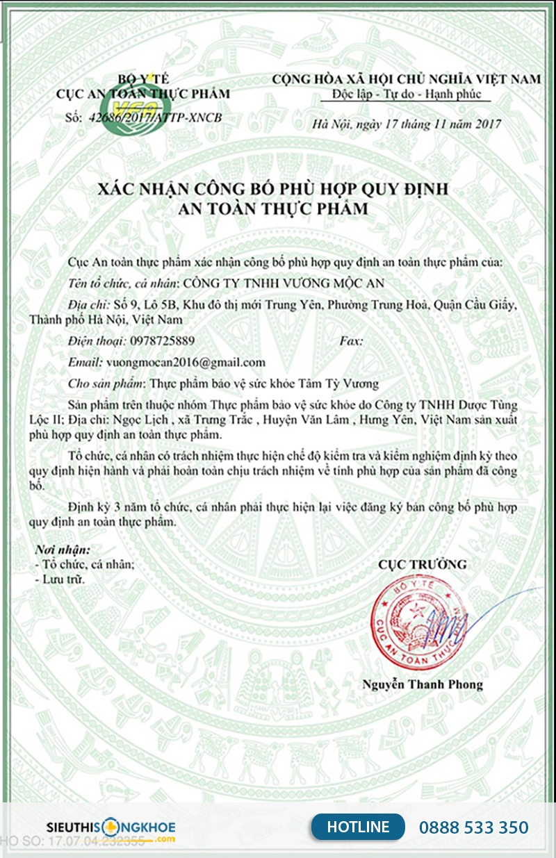 Giấy chứng nhận chất lượng của Tâm Tỳ Vương từ Bộ Y Tế